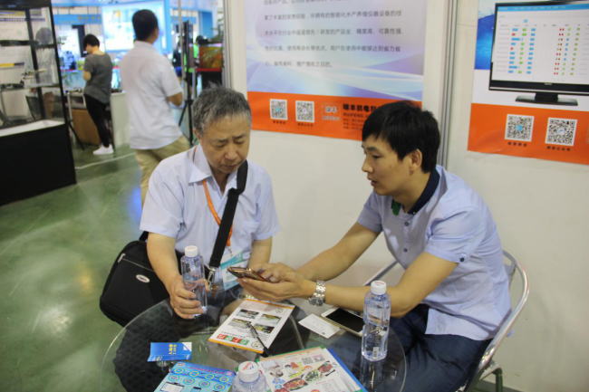 圖右:瑞豐水產(chǎn)科技劉鳳彥在給參展人員介紹溶氧儀物聯(lián)網(wǎng)APP